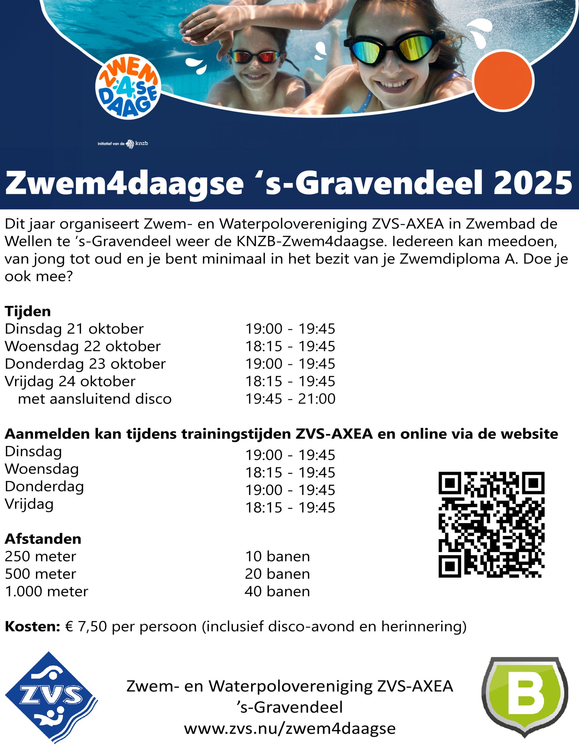 Dinsdag 21 t/m vrijdag 24 oktober 2025 organiseert Zwem- en Waterpolovereniging ZVS-AXEA tijdens de herfstvakantie de KNZB-Zwem4daagse in Zwembad de Wellen te ’s-Gravendeel.