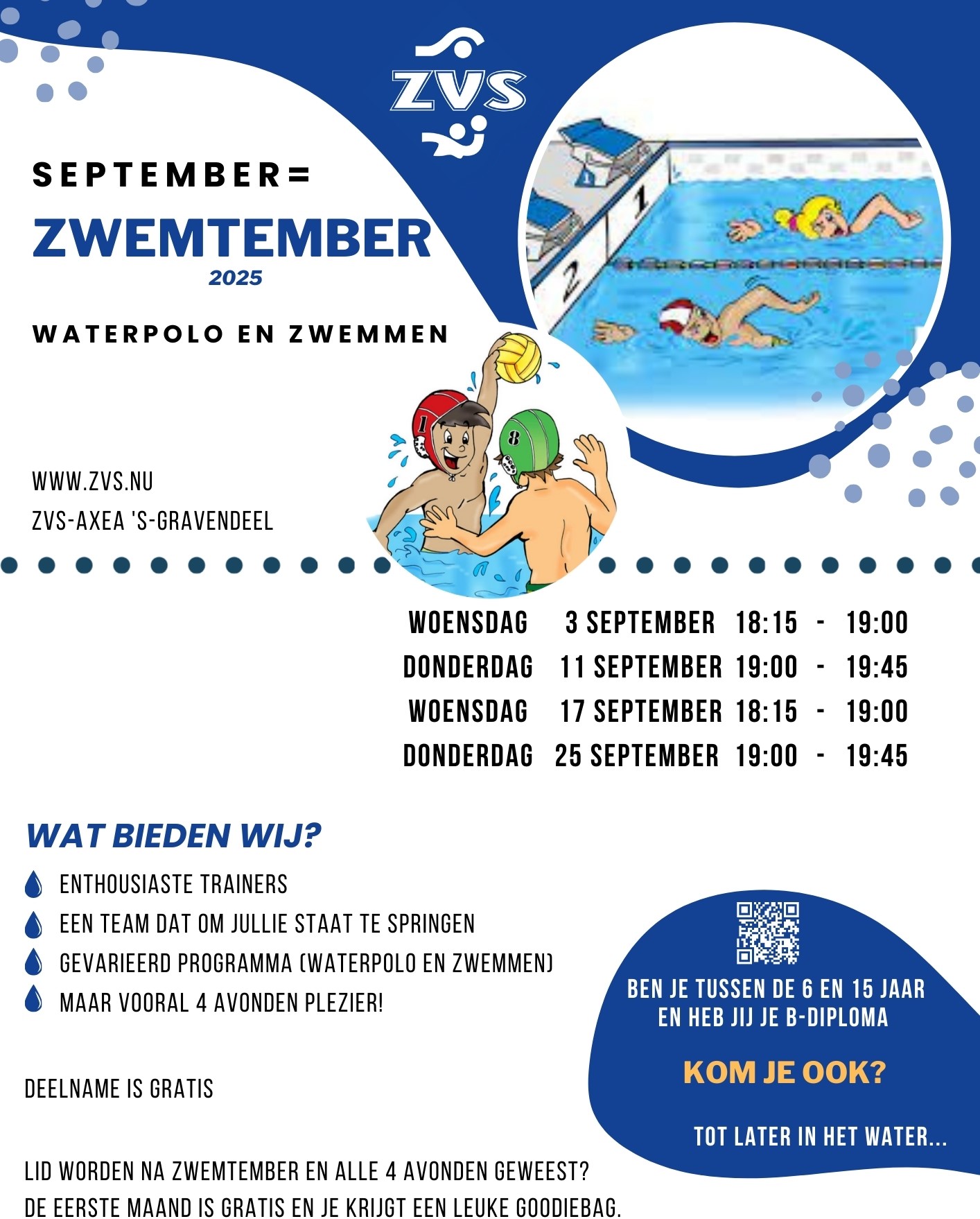 De maand september staat bij Zwem- en Waterpolovereniging ZVS-AXEA uit ’s-Gravendeel in het teken van ‘Zwemtember’. Het doel is om iedereen kennis te laten maken met onze vereniging alwaar je kunt waterpoloën en zwemmen.