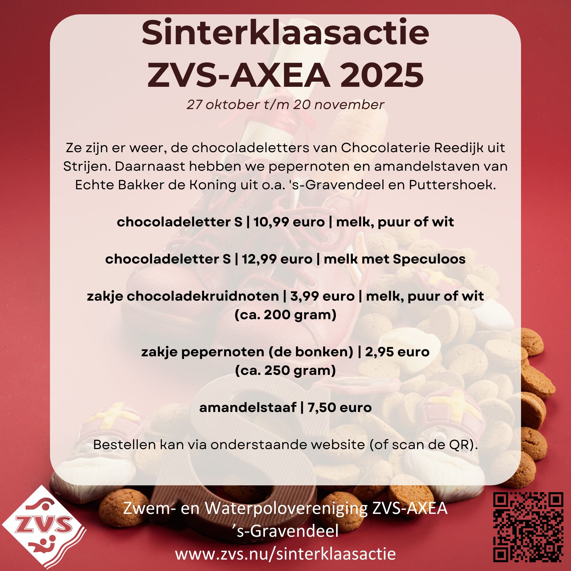 Al enkele jaren verkoopt ZVS-AXEA lekkers voor Sinterklaasavond en ook dit jaar kun je weer bestellen. Er zijn chocoladeletters en chocoladekruidnoten van Chocolaterie Reedijk uit Strijen. Daarnaast hebben we pepernoten (de bonken) en amandelstaven van Echte Bakker de Koning uit o.a. 's-Gravendeel en Puttershoek. Trouwens, dit is natuurlijk ook erg leuk om gewoon aan iemand cadeau te doen. Krijg jij ook gelijk zo’n trek? Bestellen is nu nóg makkelijker, je regelt het gewoon online.